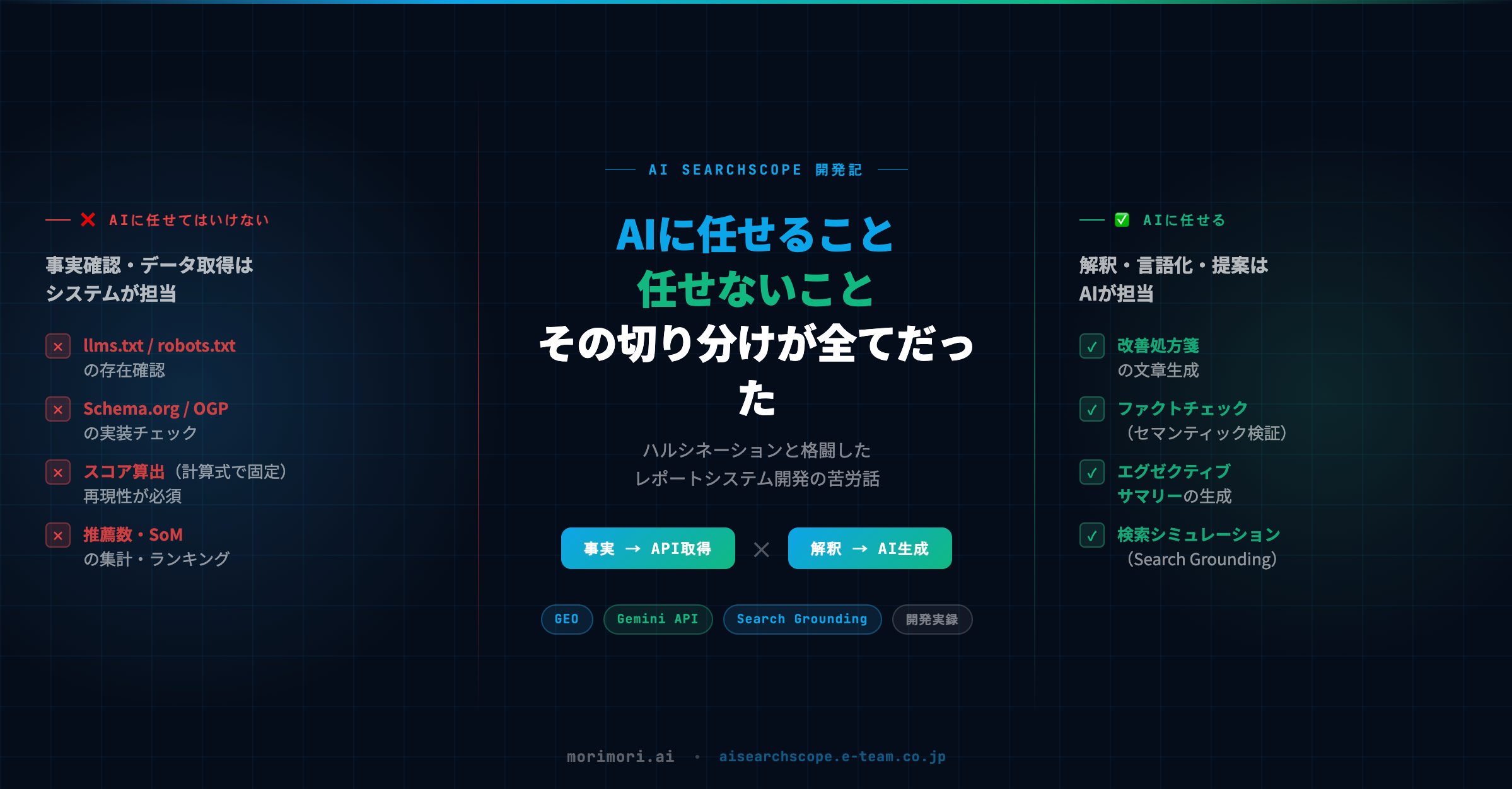 AI SearchScope開発で学んだ「AIに任せること・任せないこと」の切り分け。ハルシネーション制御の苦労とAPI×AI役割分担設計を開発者が解説。業務自動化にも応用できる実践知識。